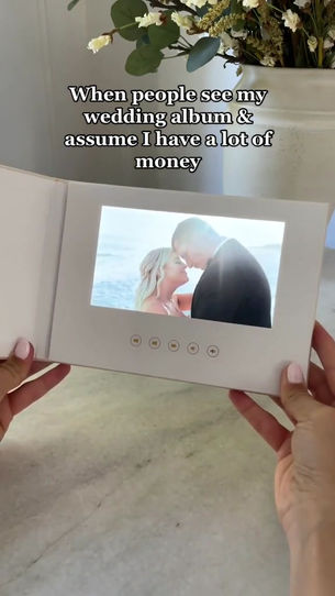 A linen-bound video album with a 7" screen, speakers, and playback control buttons all built into a sleek design. Simply open the cover and enjoy your wedding film. The battery will last nearly a year on your bookshelf. When the battery dies just plug it in with the provided USB cable and charge it back up. They can hold up to 4GB of videos, and photos can be added too. We include one free video album featuring your Highlight film.